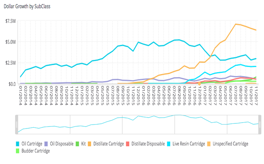 According to dispensary analytics firm BDS Analytics, distillate vaporizer cartridges overtook BHO as the fastest-growing cartridge-filler last February, and they continue to pick up speed. Fairly new to regular cannabis consumers, distillate is a potent form of THC made through a process called molecular distillation, which takes winterized concentrates – BHO or Co2 hash oil refined with alcohol or ethanol and then chilled at extreme temperatures – and then distills them to further concentrate the THC. That extra work has been noticed by consumers: As of November 2017, the monthly growth of distillate cartridges was outpacing BHO and Co2 by approximately $4 million.