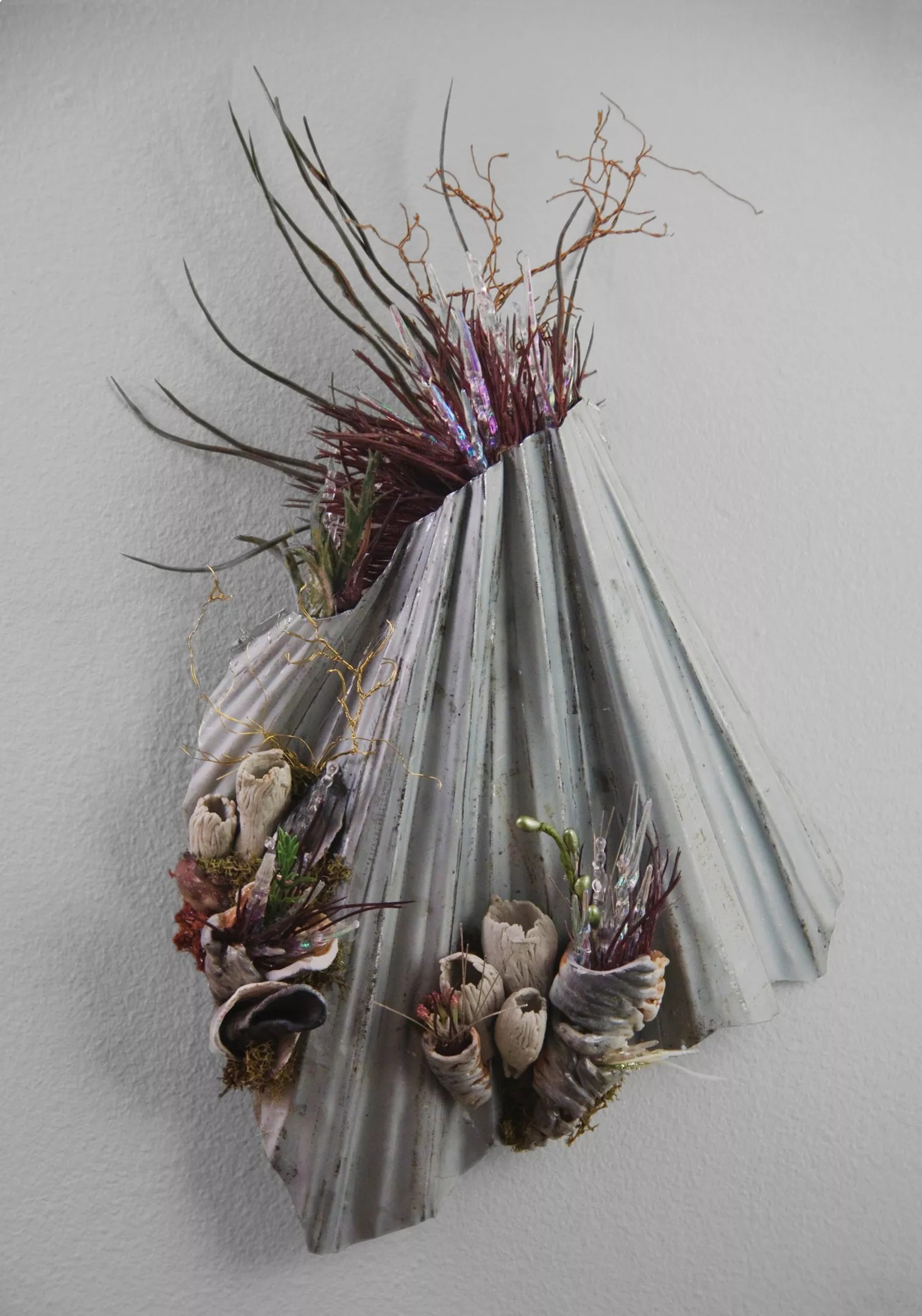 Kia Neill, “Crystalline Petrified Vessels,” sheet metal, ceramic, plastic flowers and decor, 2013.