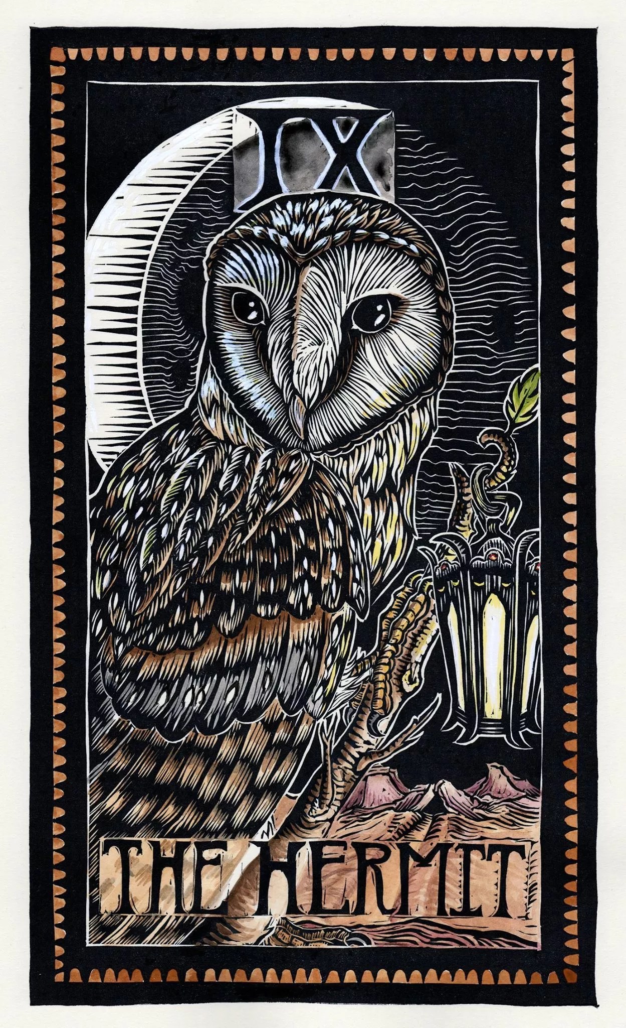 Emi Brady painstakingly hand-carved, printed and hand-colored the 79 master linocuts that make up the Brady Tarot.