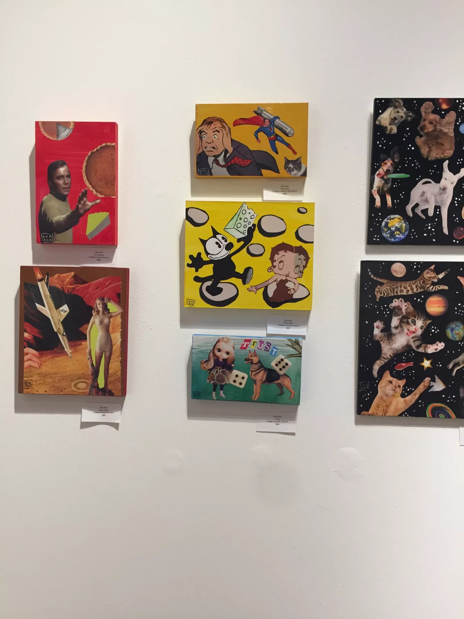 “Moon Walk” by Zoa Ace, surrounded by six collages on wood.