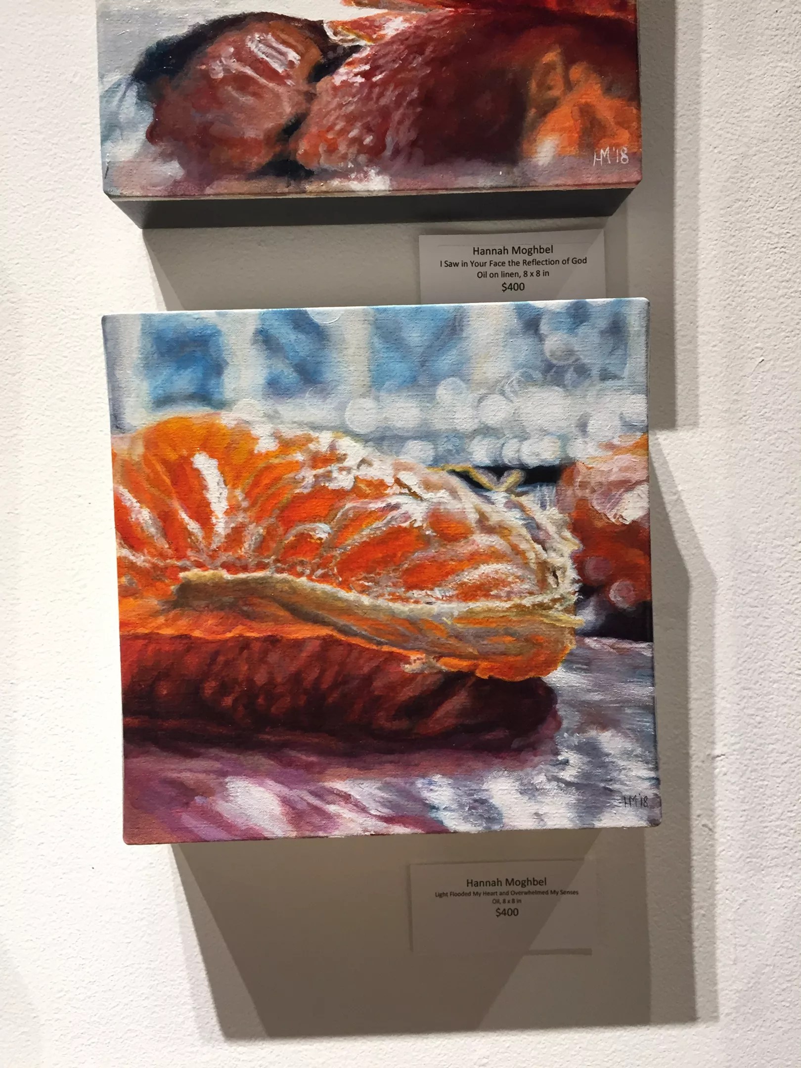 Hannah Moghbel‘s peeled oranges are at once jarring and juicy. Currently living in Colorado Springs, Moghbel is a German-Iranian immigrant who grew up in Appalachia. Between “I Saw Your Face in the Reflection of Gold” and “Light Flooded My Heart and Overwhelmed My Senses,” she captures the visceral moment when an orange peel is ripped open and the scent of citrus sprays through the air.