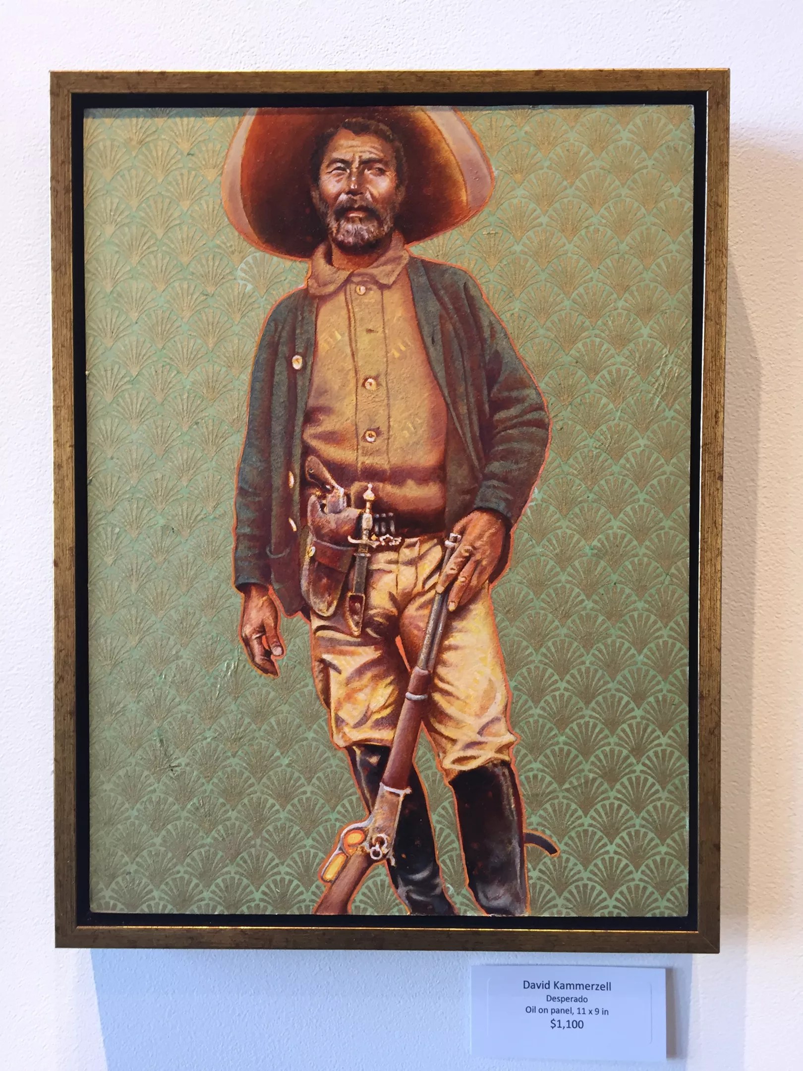In the entryway are three classic cowboys done by David Kammerzell. In “Desperado,” the subject is armed to the teeth, warily eyeing the peaceful wallpaper around him. A gentleman with two aces and two eights in his hand awaits the next card; he is at once a winner and dead broke. Born in Texas, raised in Denver, Kammerzell makes vintage-toned, nostalgic illustrations of a bygone age.