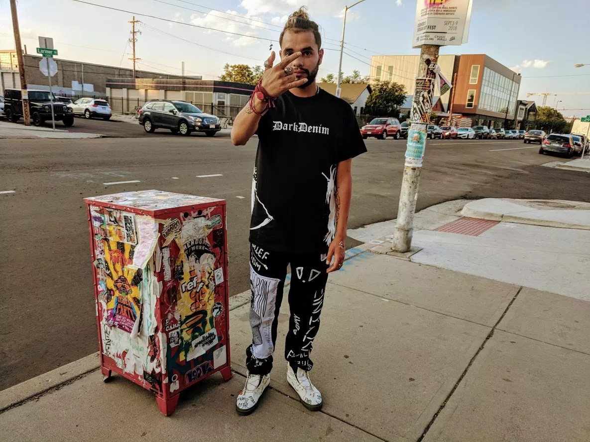We spotted designer Aldo Olivarez, who also goes by Aldo El Creator, at 29th and Larimer streets, selling items from his Dark Denim clothing line. The aesthetics of Dark Denim reflect from his outsider perspective: His designs are striking, unapologetic and dripping with attitude, with imagery that draws from underground culture, punk rock and horror movies, filtered through a modern street-wear sensibility.