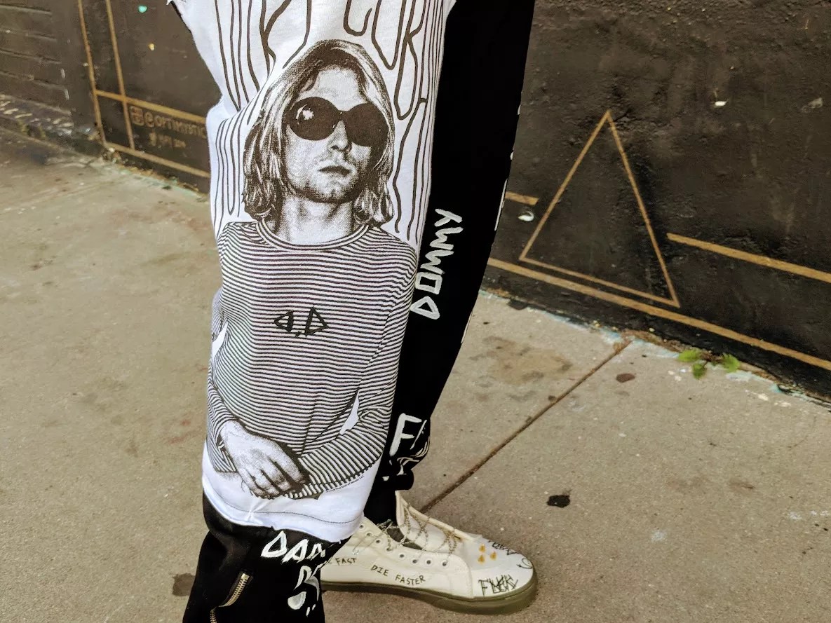 Aldo Olivarez: My whole outfit today is inspired by Kurt Cobain and just being different and weird. That’s why I put him on the pants, too. It’s a reminder to be yourself. I made them for a DJ who is more of a gothic, be-yourself kind of guy. The brand is about a rock-star lifestyle. I want people to just be themselves. You’re doing you, and other people are questioning it, but they still like it.