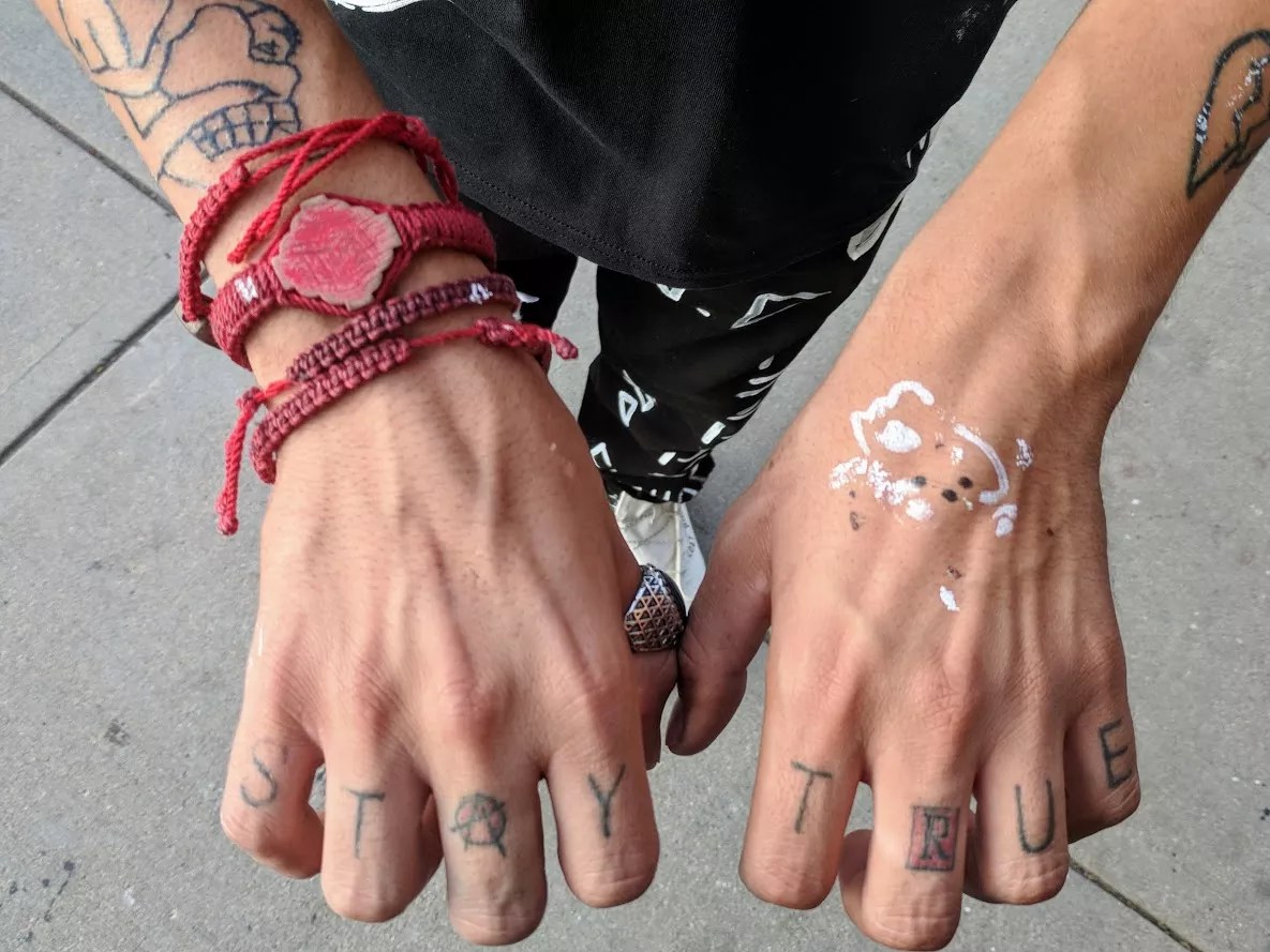 I used to be a welder, and I would draw on my jackets or pants and go to the skate park after work. People would be like, “Cool pants,” and I would be like, “Thanks, I did it.” But now this is all that I do. It’s different, because I make most of my living online or doing events in Denver. I used to be a welder, and then I quit my day job about eight months ago. Now I am solely focusing on Dark Denim. This is it. This is everything.