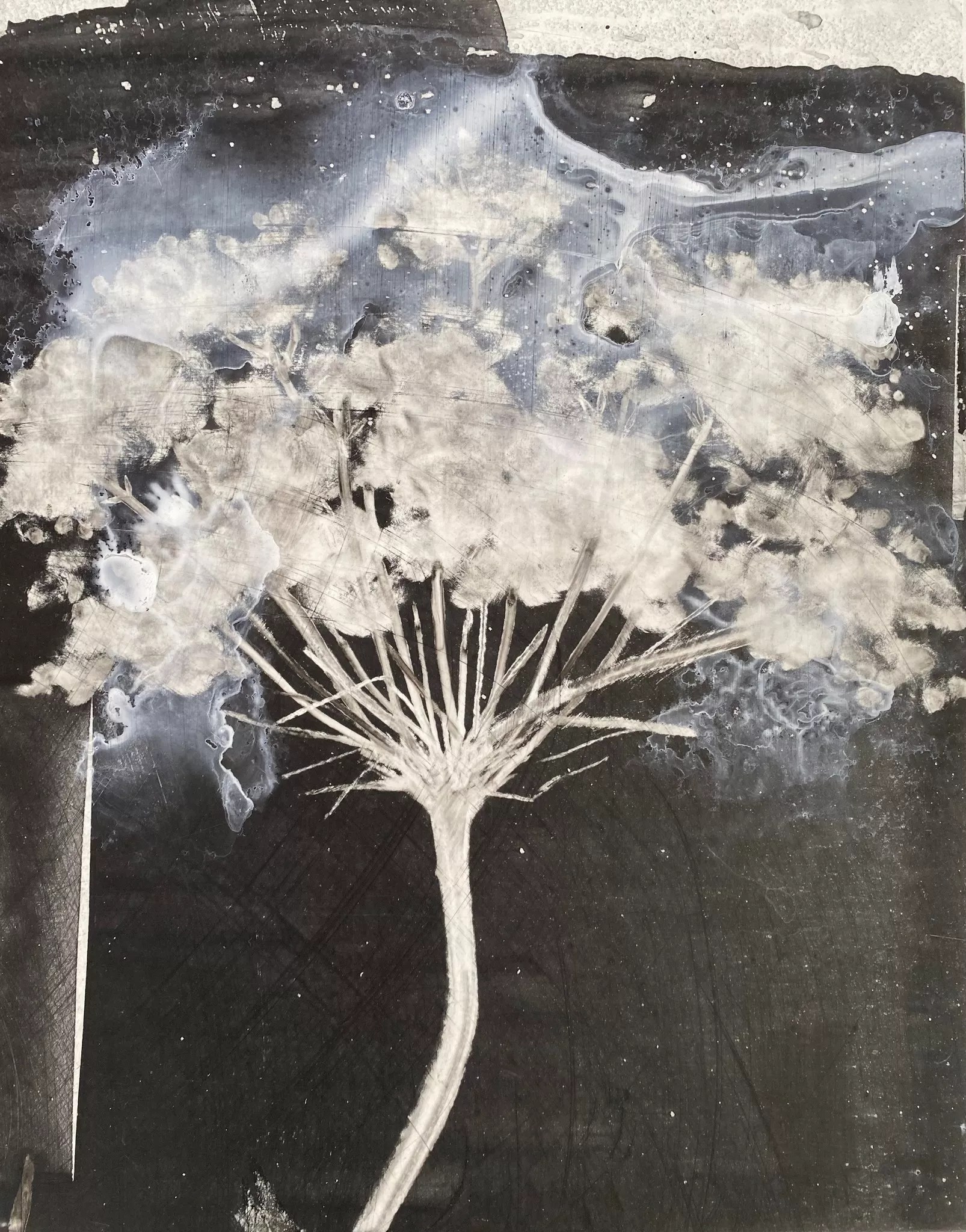 Heidi Jung, “Yarrow,” 2024, sumi ink, acrylic ink, charcoal on Mylar on panel.