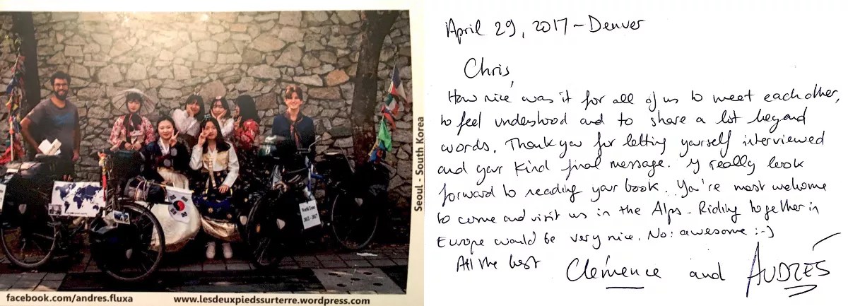 “Finally, I showed them my pictures and the website, and an [agent] said, ‘Wow! Four years and a half on a bike? I want to do that! What would you recommend as the most important thing?'”