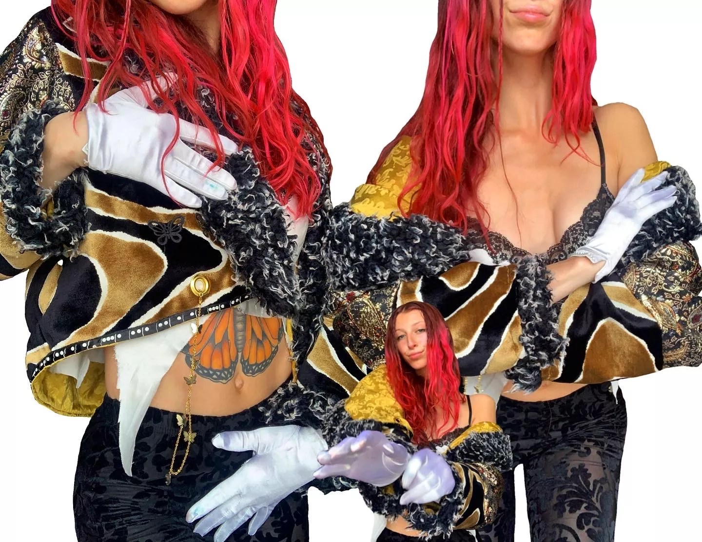 Audra Stachnik, garment upcycled with gold tablecloth, upholstery fabric, faux fur, beading, metallic fabric, Domino silk ribbon and butterfly necklace.