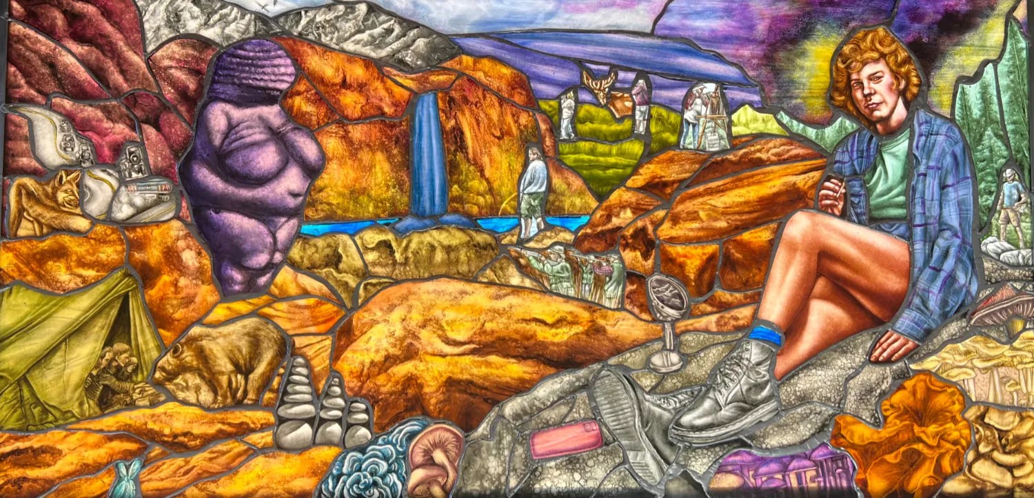 Maria Valentina Sheets, ”Urban Hiker,” kiln-fired painted and soldered stained glass.