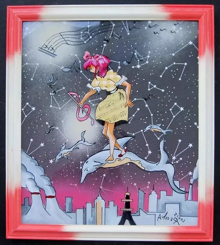 Louis Recchia, “Sounds of Music,” acrylic and collage on plexiglass. Minimum bid: