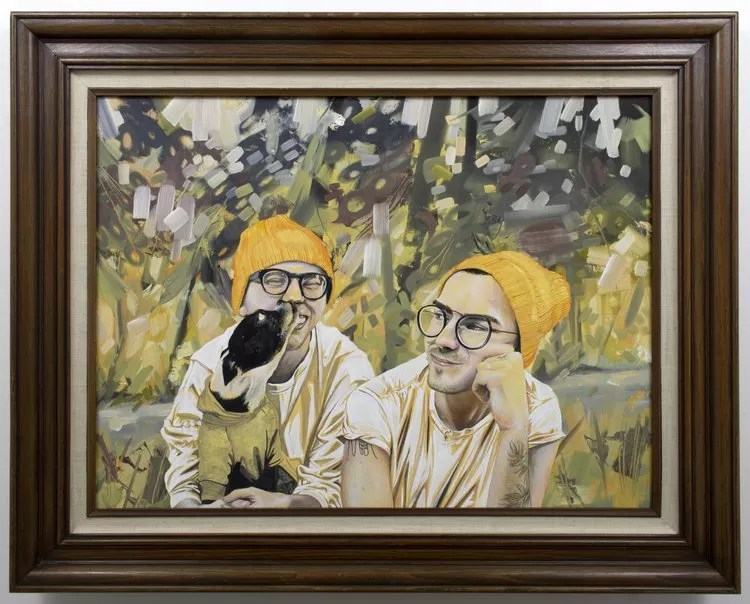 Union Hall’s latest show, the story of you and me, looks in on personal moments like a scrapbook of memories. Curated by Robert Martin and inspired by “Handsome Man,” a queer love song by Matt Albers, the story of you and me showcases work by Erickson Díaz-Cortés, Jordan Ramsey Ismaiel, Em Van Loan and Martin themselves, all artists on the LGBTQ+ spectrum. The overall look of the show exudes rays of intimacy, friendship and physical and romantic love. It might just be the most romantic show you’ve seen in an age.
