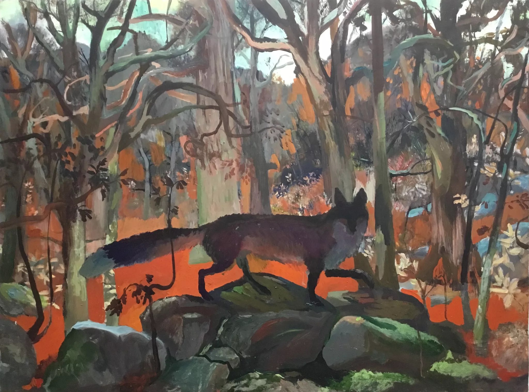 Johnny DeFeo’s Soft Eye is in part a paean to a sweet horse he bought in an online auction, while also addressing the landscape, history and buildings of the Southwest, as observed from his home in Taos, New Mexico. This representational view goes back eons to imagine the wild land where only untamed creatures roamed before it was overrun by human civilization.