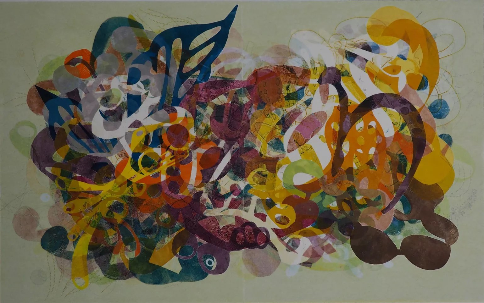 Printmaker Taiko Chandler shares a nice slice of her beautiful work for The Indelible Garden at the Denver Botanic Gardens, from shapes of color floating across stenciled monoprints to the transfers of swirling ink designs on glass to sheets of Tyvek, transformed by cut-outs and arranged in flowing dimensional shapes. Not only will Chandler’s mastery of technique and its results amaze viewers, but it also has the power to enchant.