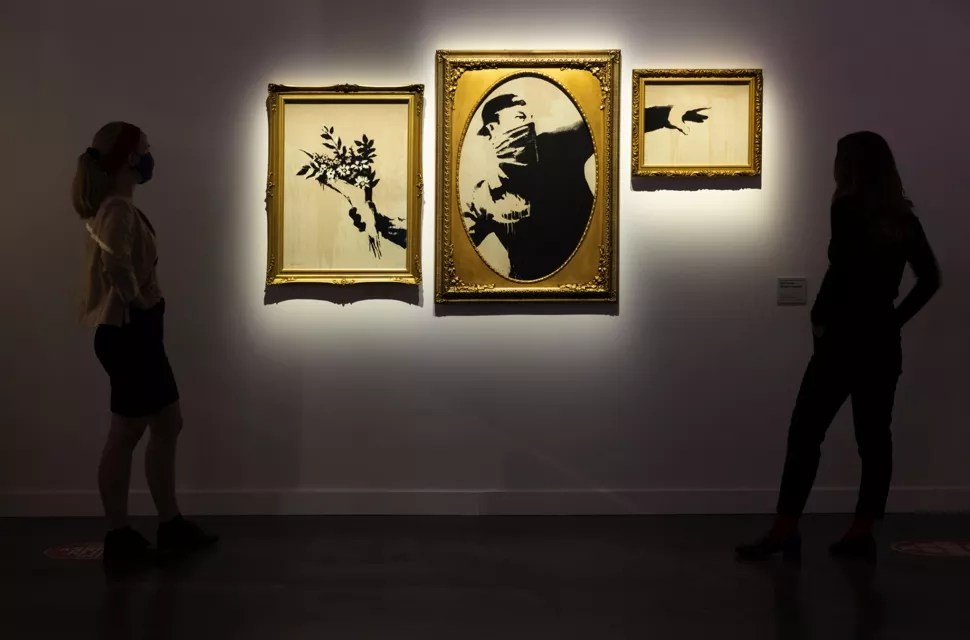 “Flower Thrower” is one of Banksy’s well-known works at the exhibit.