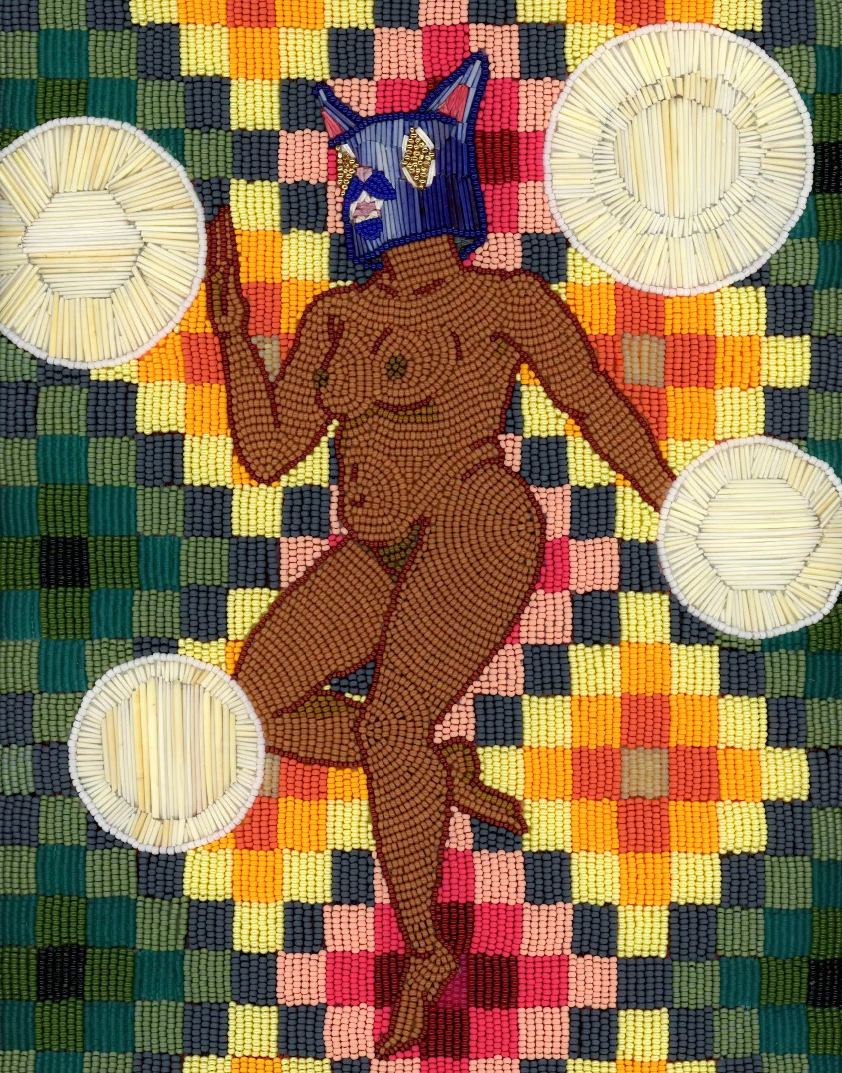 Chelsea Kaiah, “Recusant Ute and Her Absence,” 2023, porcupine quills (natural and dyed), seed beads, greasy opals, gold Charlotte beads, antelope hide, felt and rope.
