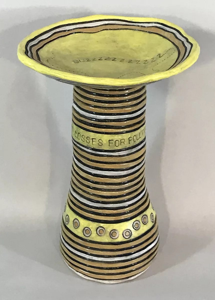 Ceramics artist Gayla Lemke has been hard at work creating wonderful, wavy, whimsical towers and garden birdbaths for Ripple Effect, a show about climate change, as well as a froggy series, The Frogs Are All Gay, inspired by Alex Jones’s conspiracy theory about the government “putting chemicals in the water that turn the frigging frogs gay.” Fellow Edge member Alane Holsteen’s abstracted landscape-derived paintings for Hiraeth take on a somber tone in the face of nature’s battle with climate change.
