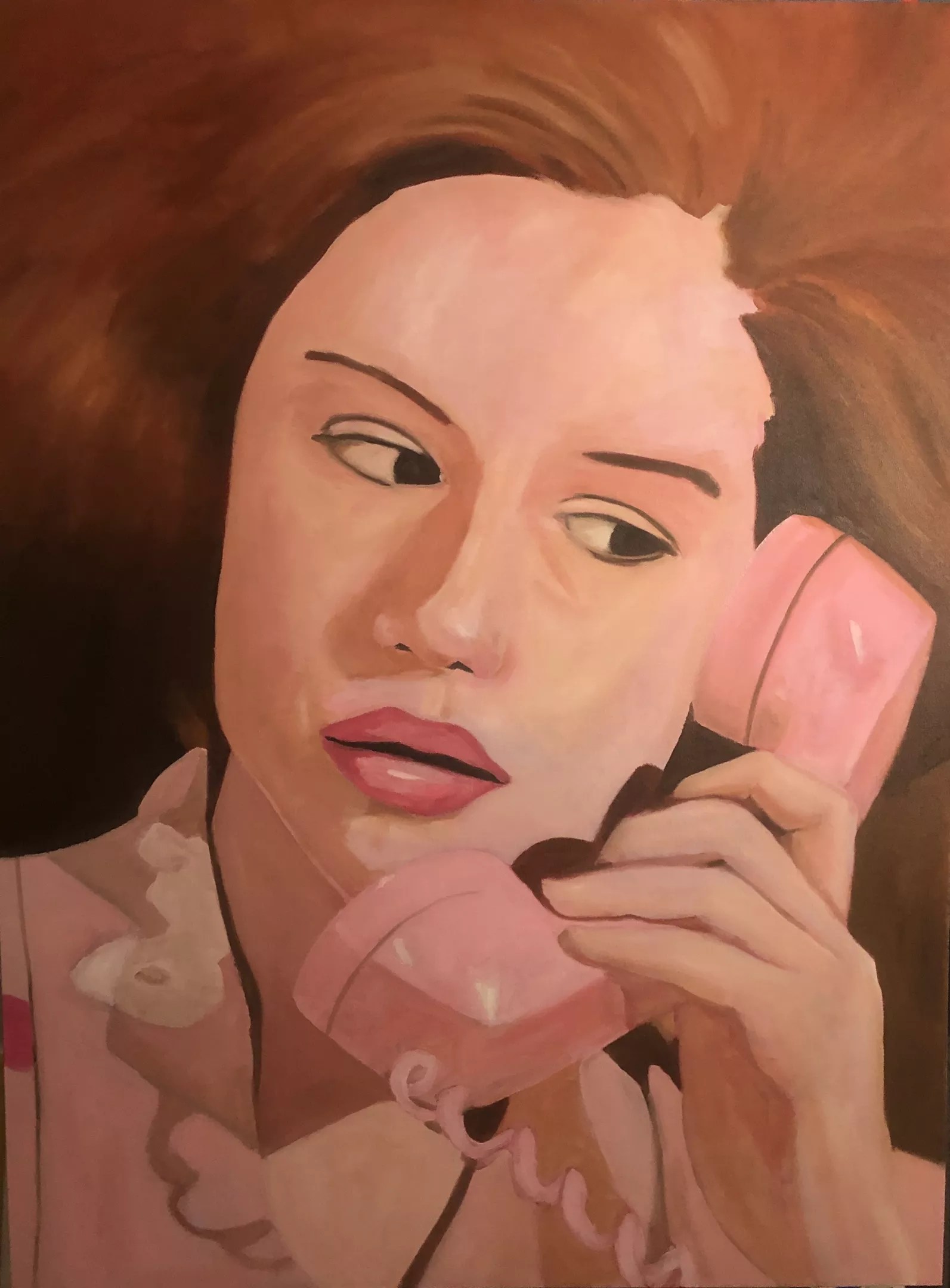 Yes, COVID-19 lurks in this show, too, where Alex Paozols’s large oils depict images lifted from the movies of women using old-fashioned telephones to drive home the idea of a landline as the overarching metaphor.