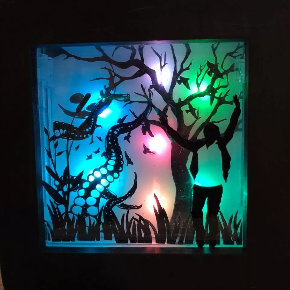 Artist Corinna Espinosa is a bit of a mad scientist: When left to her own devices, she’s dreaming up kinetic cut-out pictures that are bathed in flashing lights, souped up with electronics and arduino technology, and captured (or trapped?) inside clear acrylic boxes. At other times, she might be collaging together vaguely macabre scenarios or 3-D-printing visual dirty jokes. Join Espinosa on Saturday for a tour of her weirdly delightful world.