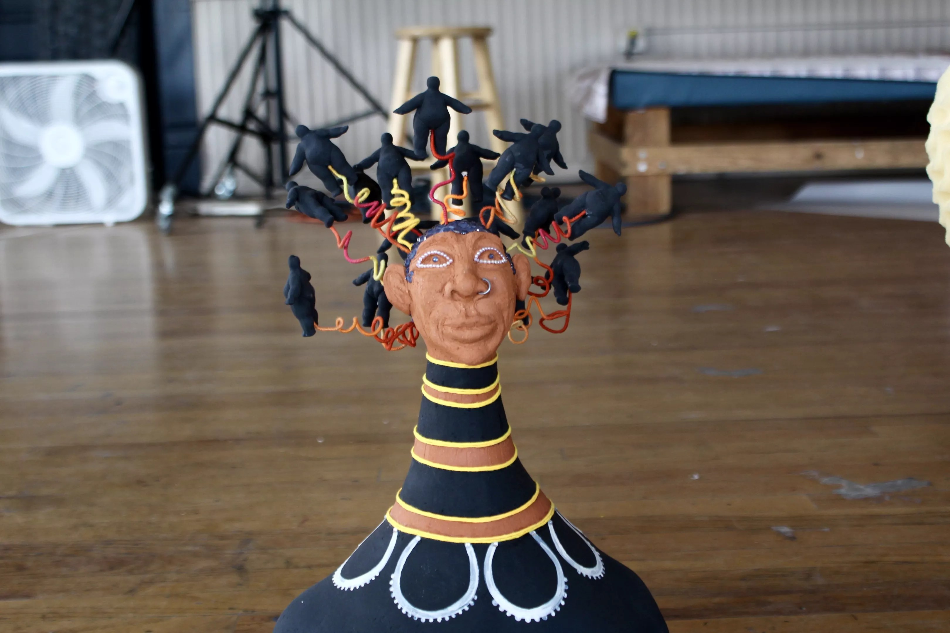 Brown picks up one of her clay figures, a long-necked woman with pearl-crested eyes and pops of red, yellow and orange. “She has all these kids in her hair,” she says, “but it could be her crown.”