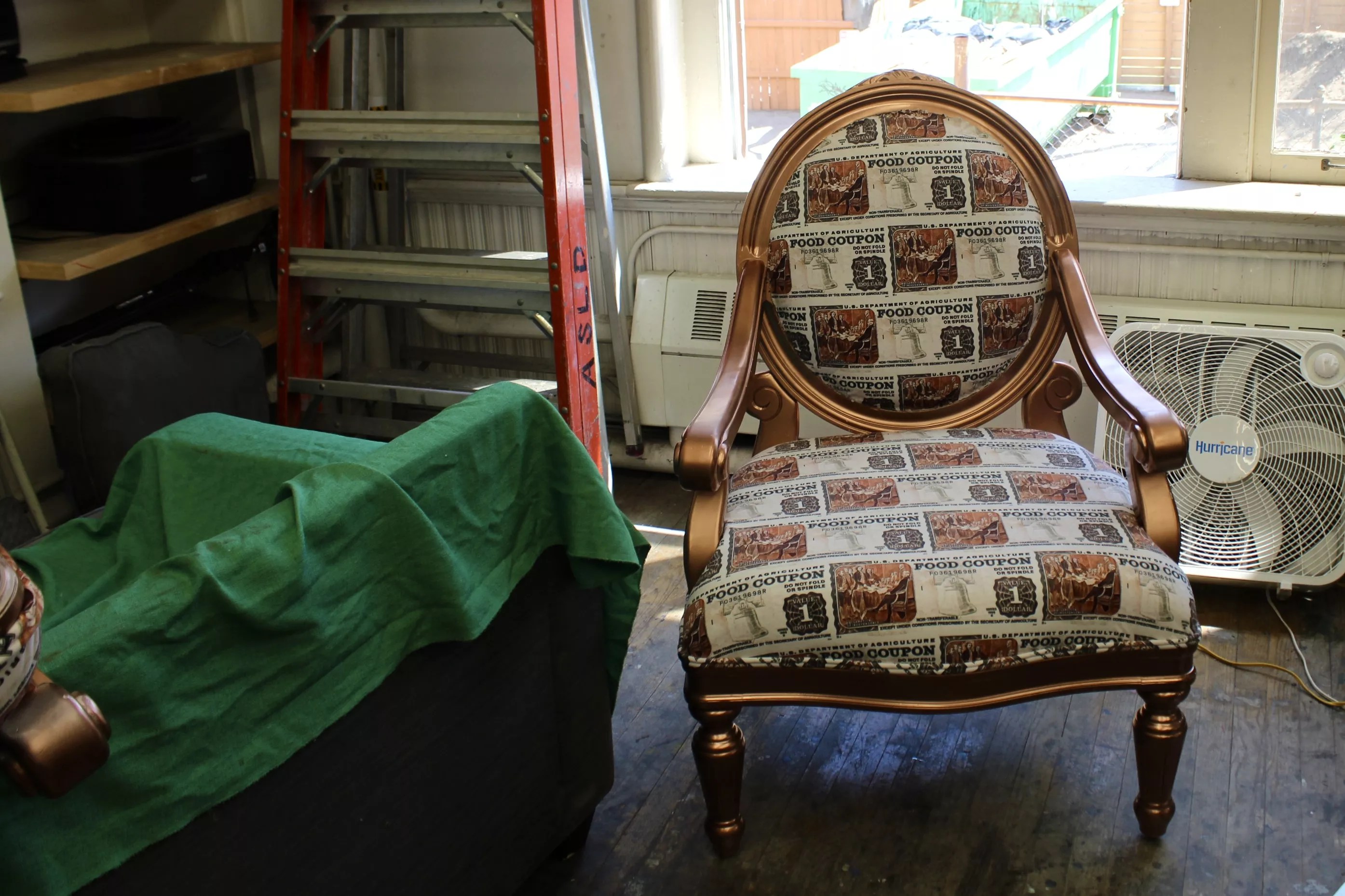 The food-stamp fabric lines some of the exhibit walls and was also used to reupholster Marie Antoinette-style chairs. “I’m a little obsessed with Marie Antoinette,” Brown admits. “She was young, they hated her because she did what she wanted to do, and she just happened to be a woman in that time. This is my interpretation of Desi Antoinette.”