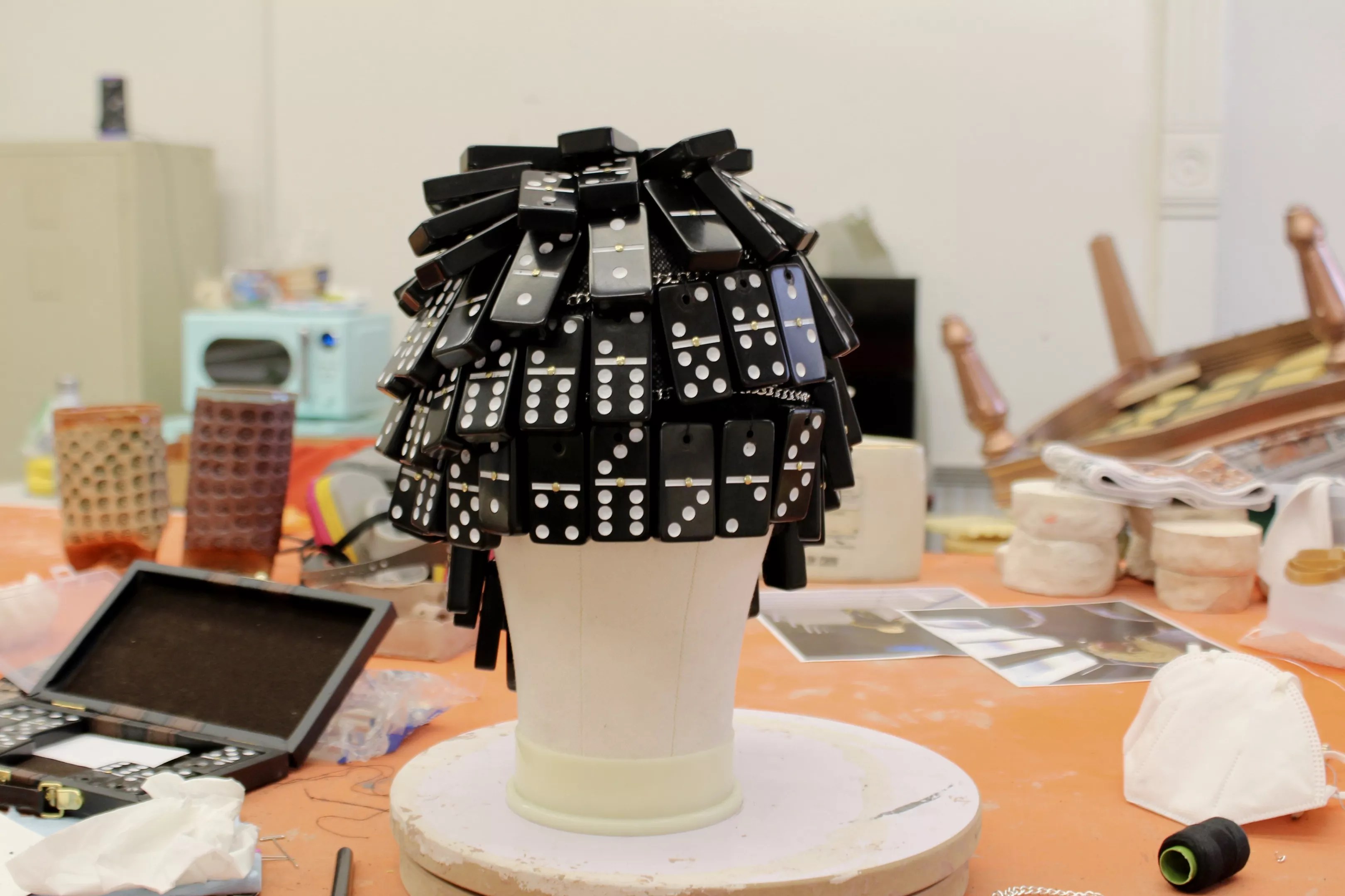Brown’s son loves to play dominoes, so she made a wig out of them.