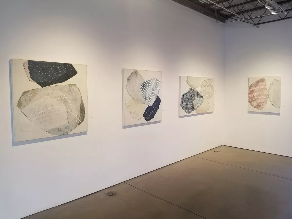 Despite the gallery’s role as a part-time hotel ballroom, owner/director Michael Burnett continues to put together high-quality shows, and Wonderland definitely qualifies. It begins in the entry space with an in-depth selection of work by Canadian artist Karine Léger. The compositions of Léger’s acrylic-on-canvas paintings comprise one or two large, hard-edged organic shapes filled in with dense patterns of marks floating against light-colored, nearly white grounds. In “Keeping You Close, #13,” Léger has painted a rough sphere using slivers of shapes that carry out the three-dimensional illusion. The slivers are decorated in different ways; one is dove gray with white polka dots, another black with white scribbles.