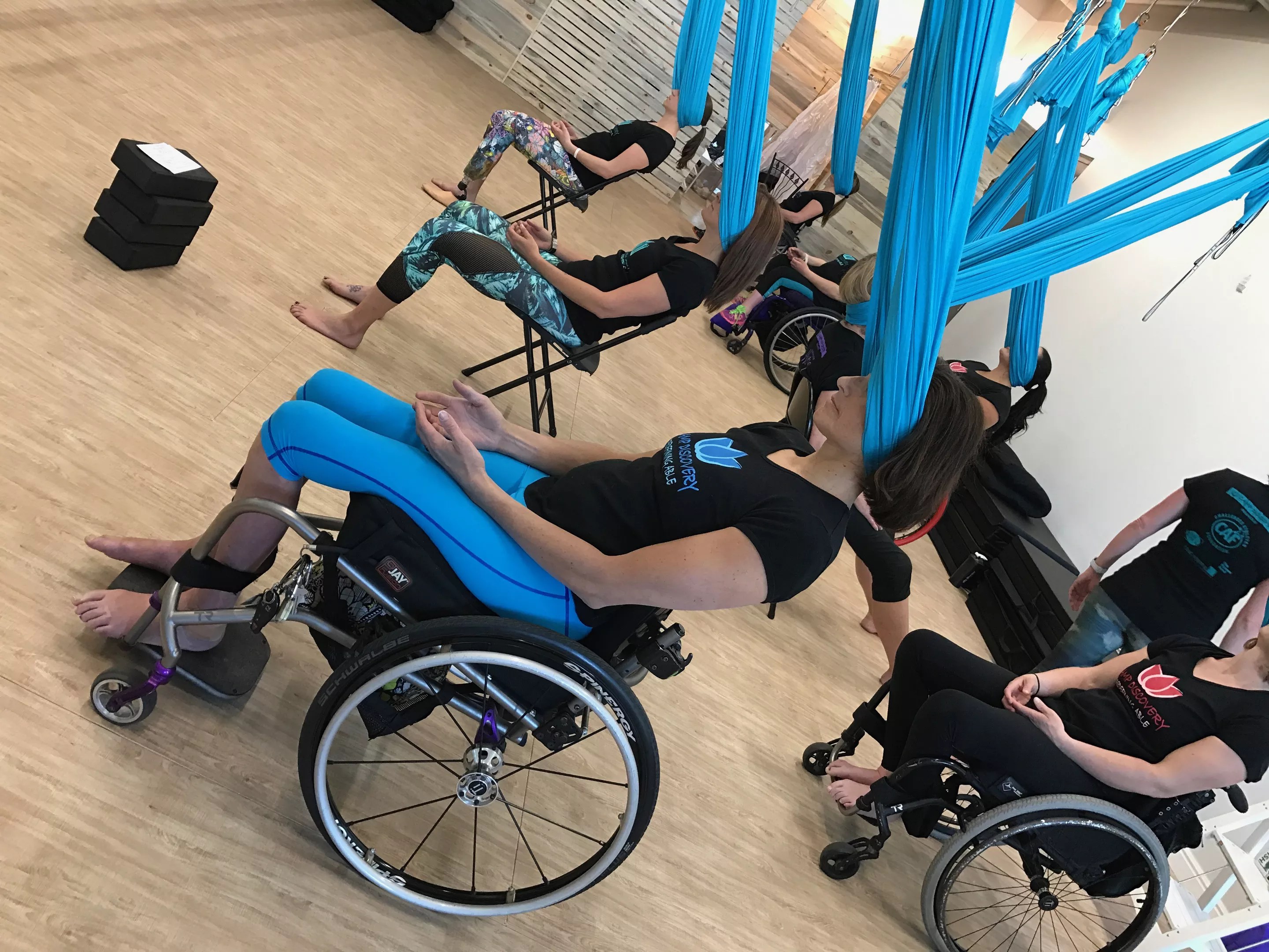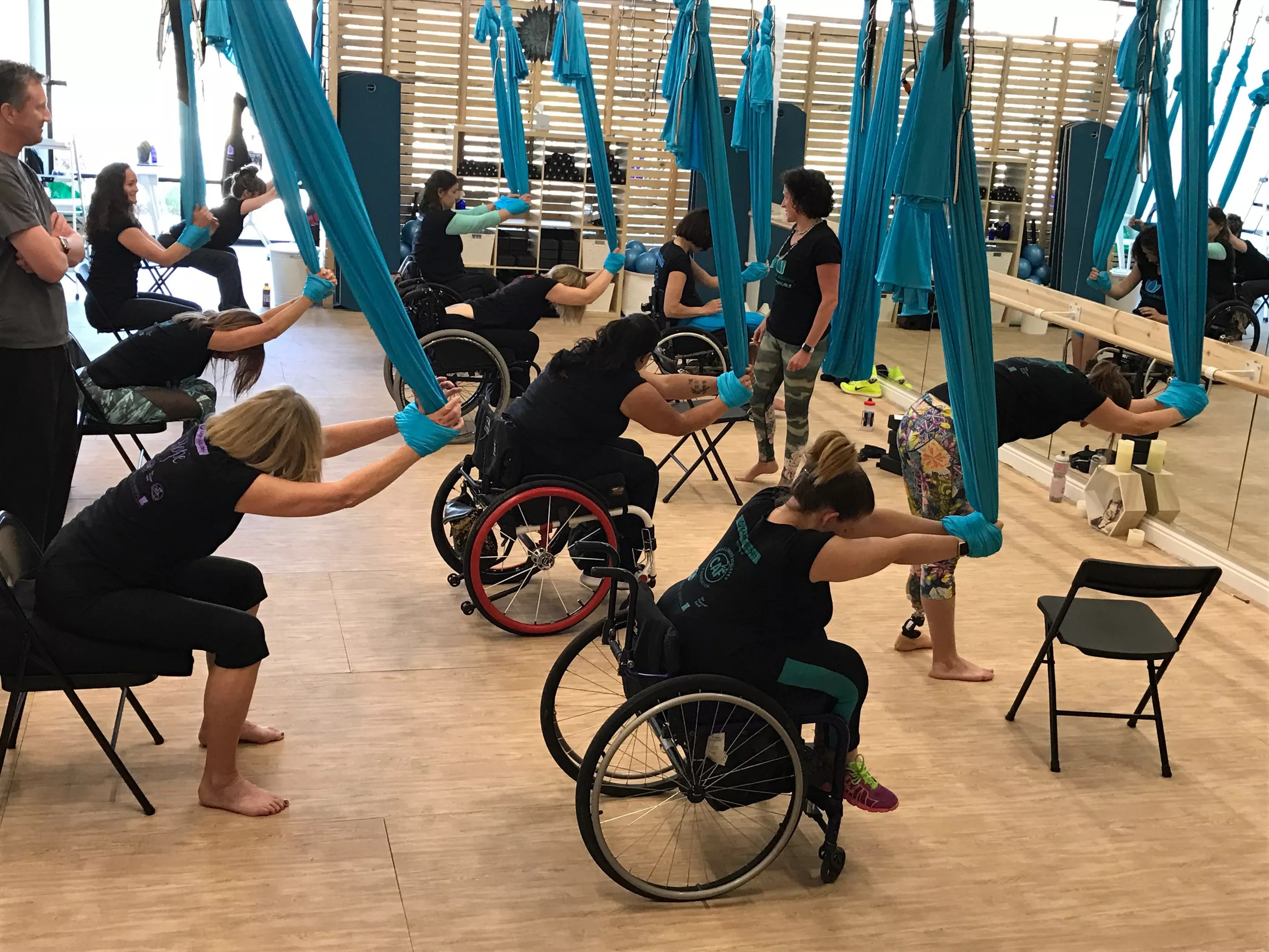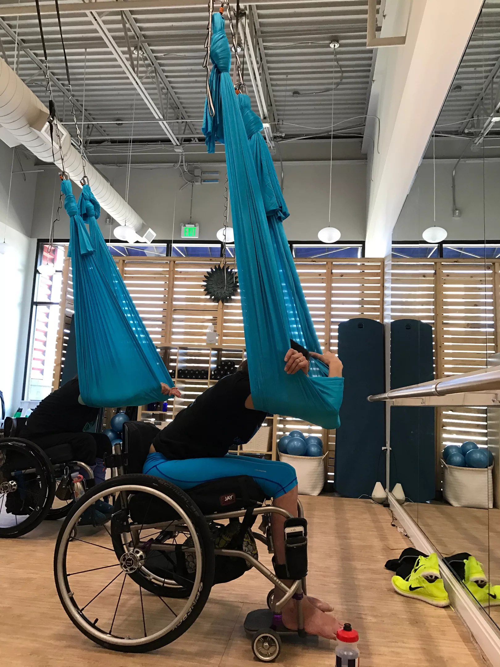“You think aerial fitness, and it’s only something able-bodied people can do, but it’s just not the case at Atherial,” says Tricia Downing, who was confined to a wheelchair when she started working with Schaffer to help customize Volo Adapt as it relates to challenged athletes. She tested out moves, provided feedback and reached out to her network. “We went to Atherial together one day and learned about aerial yoga, how to keep it safe, and once we started working with the silks, we started thinking about what body movements we could incorporate into the program,” Downing says. “It’s been really remarkable to realize how much good stretching can do.”