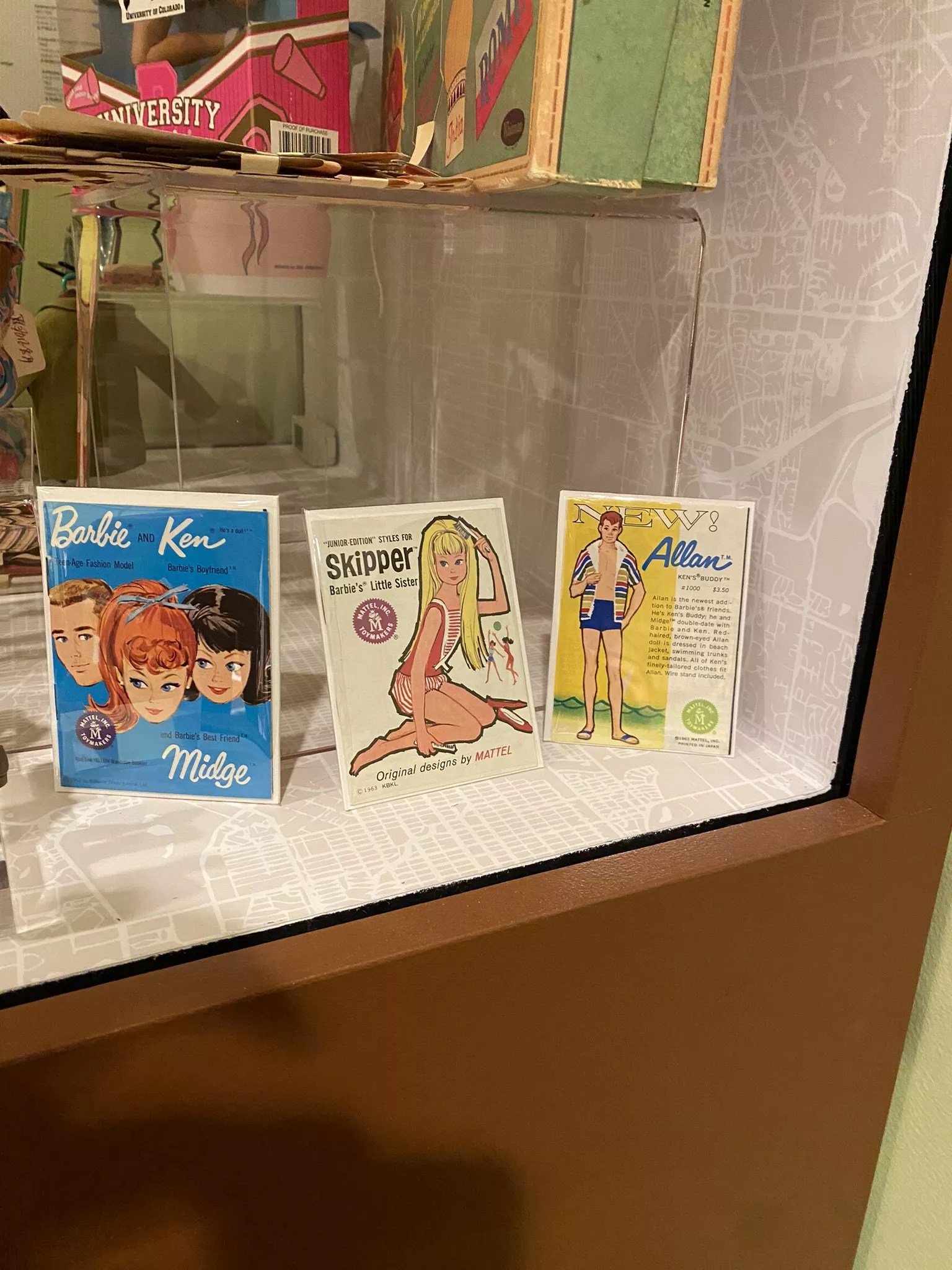 Understandably, then, it took some time for Kronwell to complete pairs of shoes for the History Colorado display, and most of the pairs belong to Ken. The dolls and other items were donated to the state’s history museum over the years; the display includes a limited-edition University of Colorado Boulder cheerleader Barbie, still in its box, while the others carry the worn looks of many years of handling by loving owners. There’s a brunette version of the 1959 debut doll, Teenage Fashion Barbie, with her black-and-white-striped one-piece (she has a single shoe); as well as a Christie, a Black doll introduced to the Barbie-verse in 1968 (there wouldn’t be a Black Barbie until 1980); and an original-style Skipper, Barbie’s superfluous little sister, who was born as an eight-year-old in 1964.