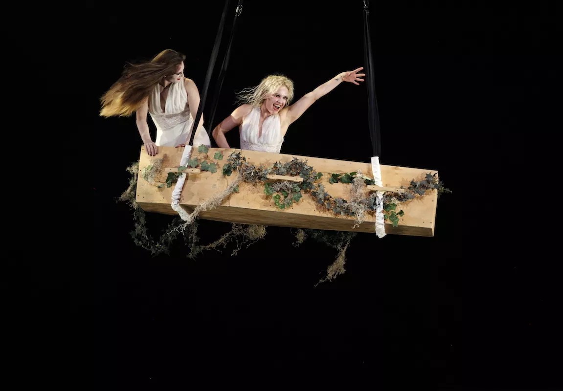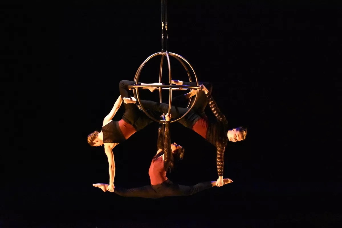 Angela Folz, Maya Muenzer and Sarah Harrison execute a high-flying move, in Flight Path.
