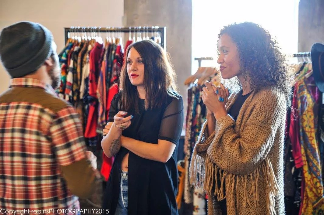 Fashionistas talking shop during a fashion market at Green Spaces in RiNo.