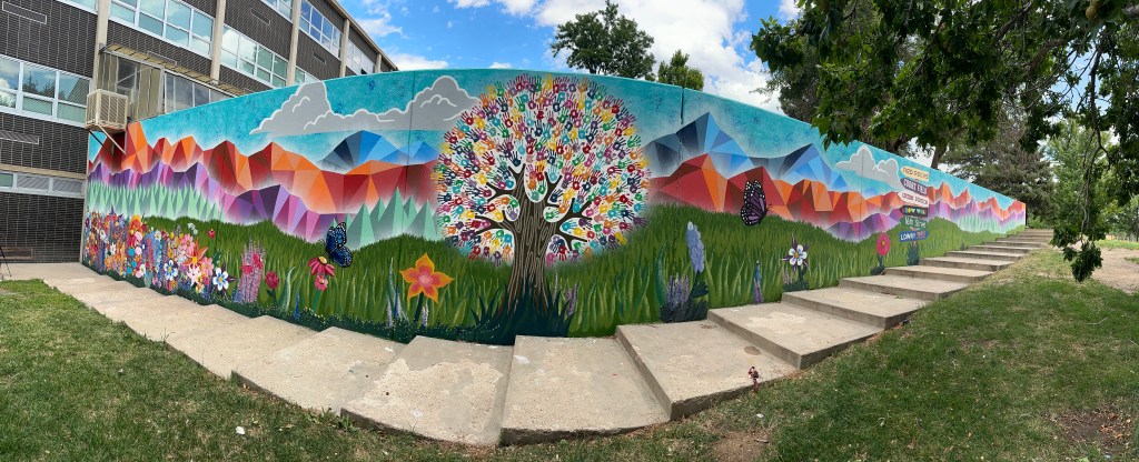 That mural takes direct inspiration from the nature surrounding George Washington High School, as well as the Denver area in general. The foothills and mountains loom in the background, while butterflies flit from flower to flower in the foreground next to signs pointing towards Red Rocks Amphitheatre, Meow Wolf and other local landmarks.