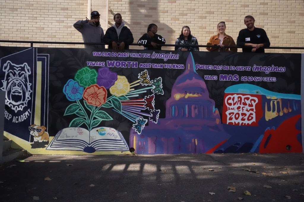 The mural itself looks like a collaborative product: a mixture of ideas and visions that celebrate PREP Academy’s Class of 2026, from bright flowers and butterflies to a depiction of the Colorado State Capitol in soft blues and purples. A yearbook filled with messages and signatures from those who worked on the project sits in the bottom left corner of the wall. At the top, the message “You Can Do More Than You Imagine” is painted in purple letters.