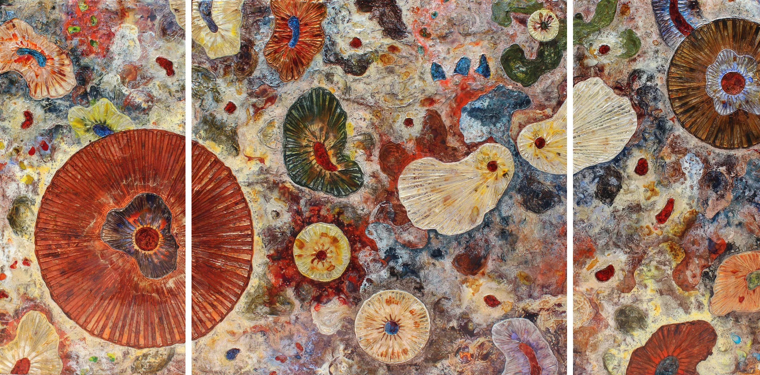 Get insights into the science behind artworks by Monica Aiello, Tyler Aiello and Katie Caron at an artist talk with the trio at the Arvada Center. The Aiellos, an artist couple, have compatible but very different styles: Monica, a painter, is known for her large, detailed landscapes of terrestrial bodies other than Earth, while Tyler, a sculptor, renders the microscopic world in airy sculptures pieced together with metal and wood, as if created with a more sophisticated, hand-cut erector set. Caron also blows up imagery in 3-D – in this case, branching physical structures of the human body or ocean detritus.