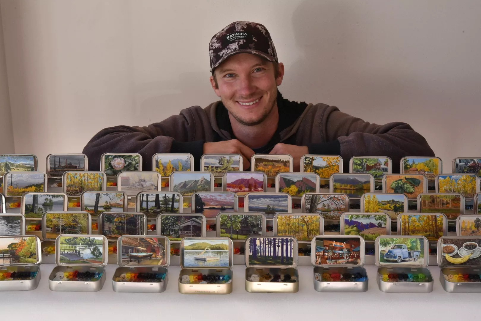 Remington Robinson at his Boulder studio with some of his Altoid-tin paintings.