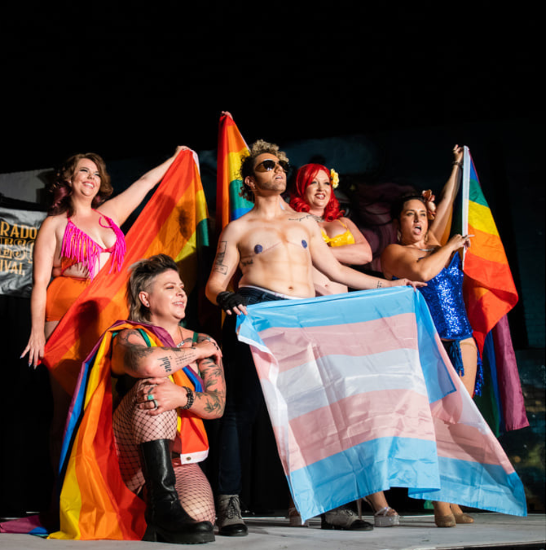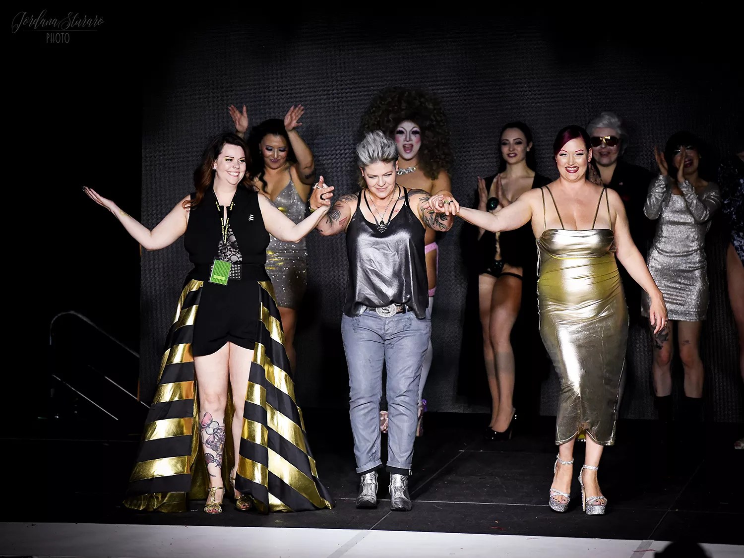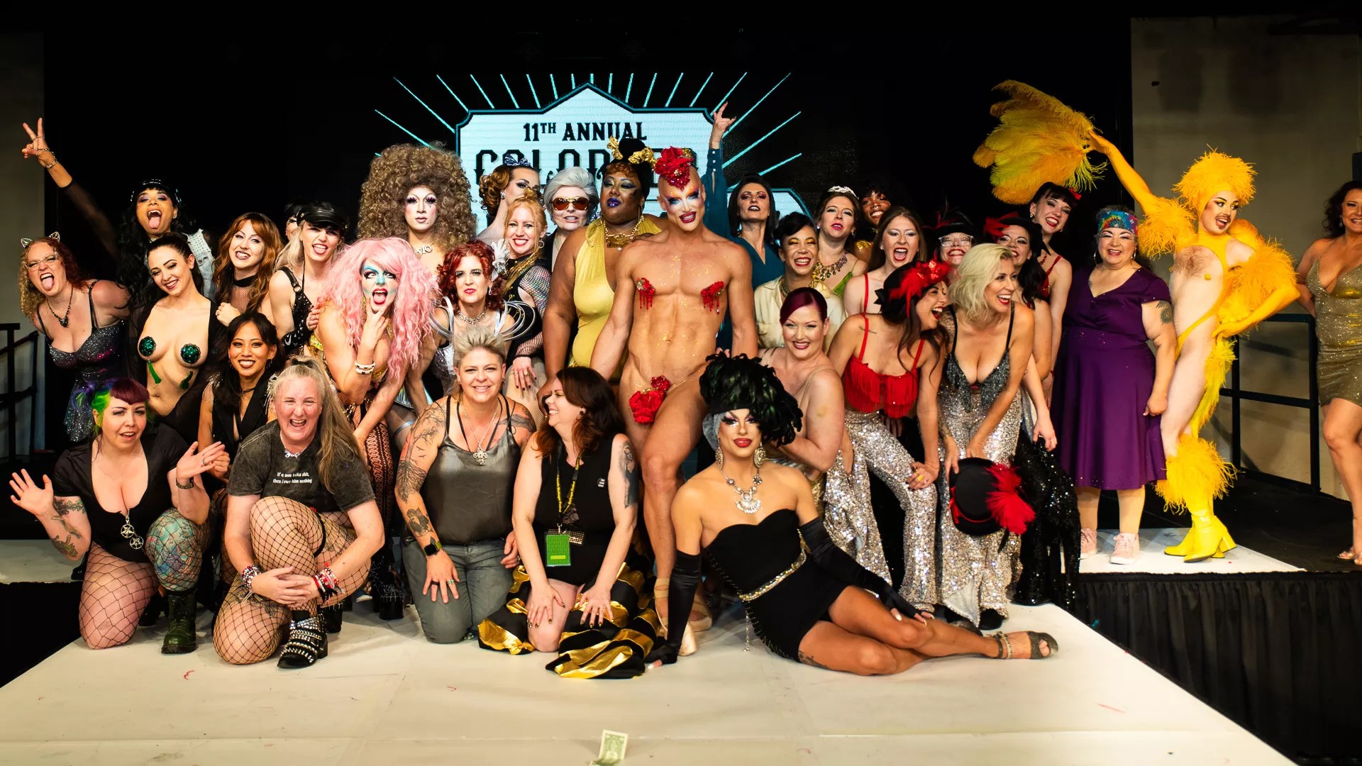 The Colorado Burlesque Festival organizers appear on stage alongside some of the performers.