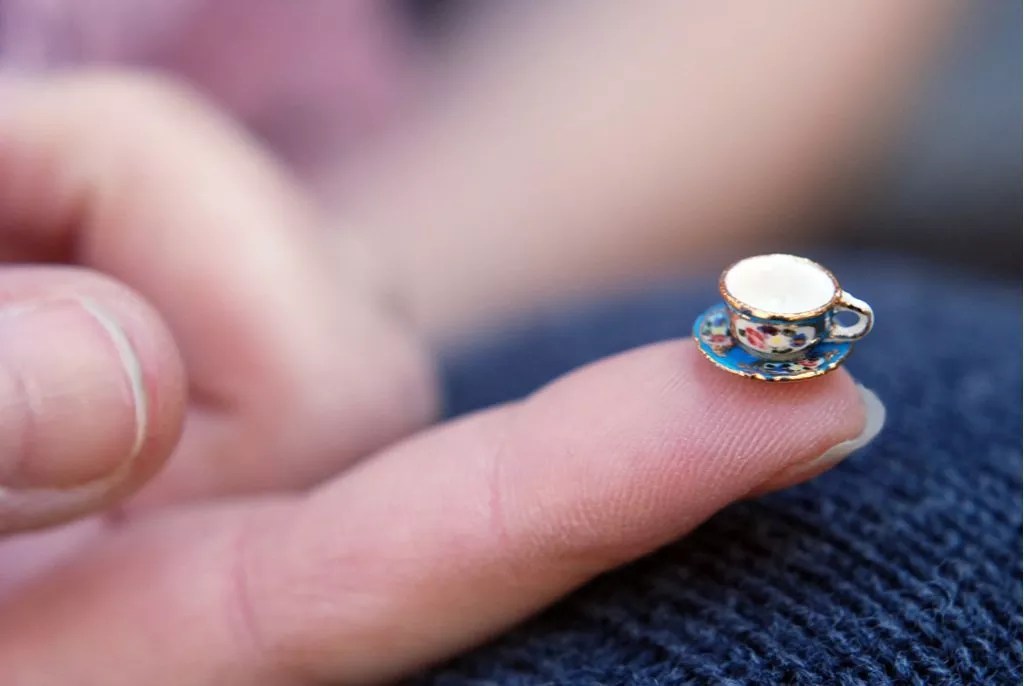 A tiny coffee cup is one of the miniature displays.