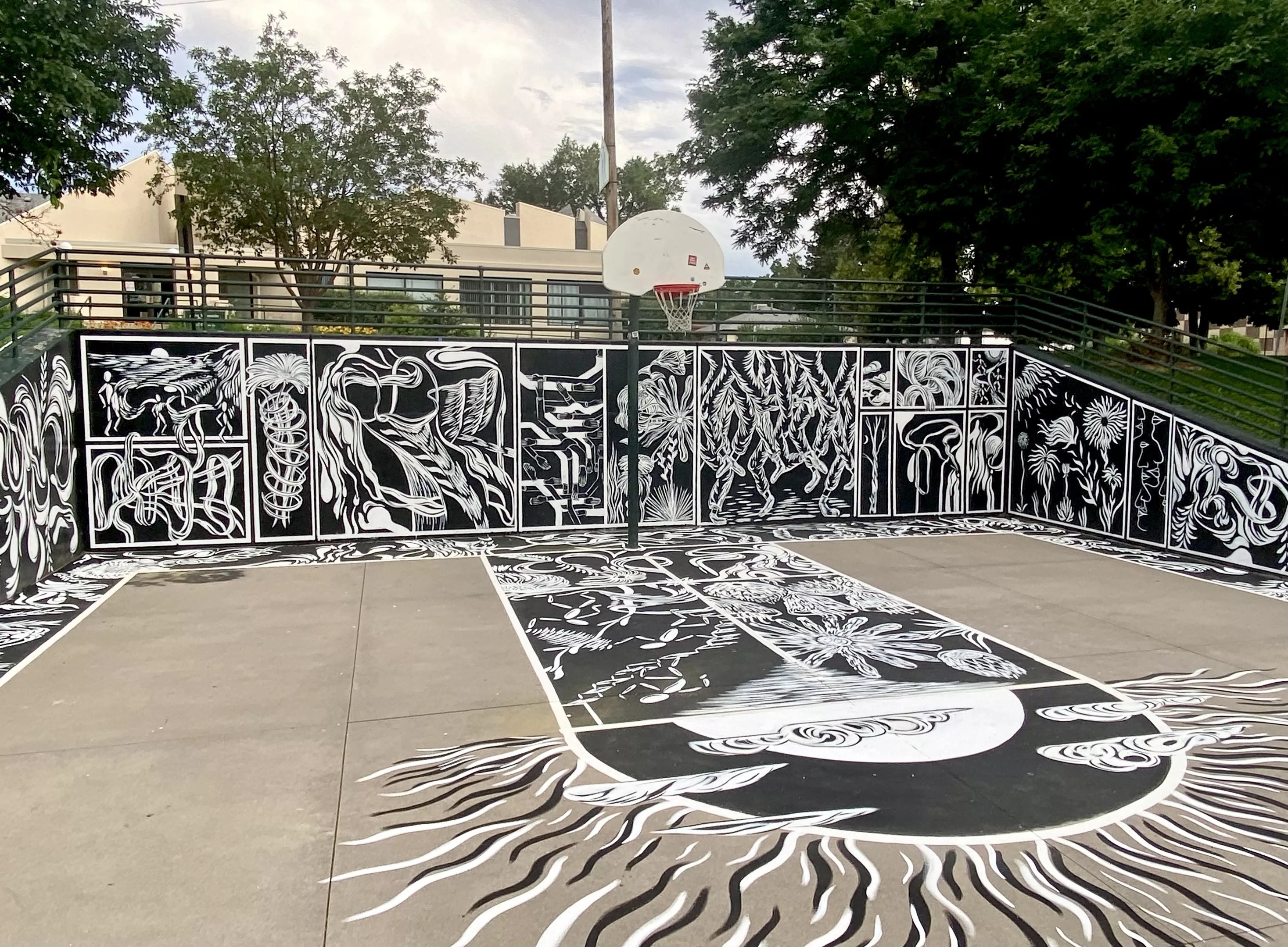 The mural, painted by 28-year-old Denver artist Markus Puskar, is a collage of shapes and images that can be colored in by visitors with chalk. The mural covers the entire perimeter of the basketball court, beautifying a corner of Sunken Gardens Park, 800 Delaware Street. It was funded by a Denver Arts & Venues P.S. You Are Here grant, which supports projects that help to activate Denver’s outdoor spaces through artworks that will attract passersby.