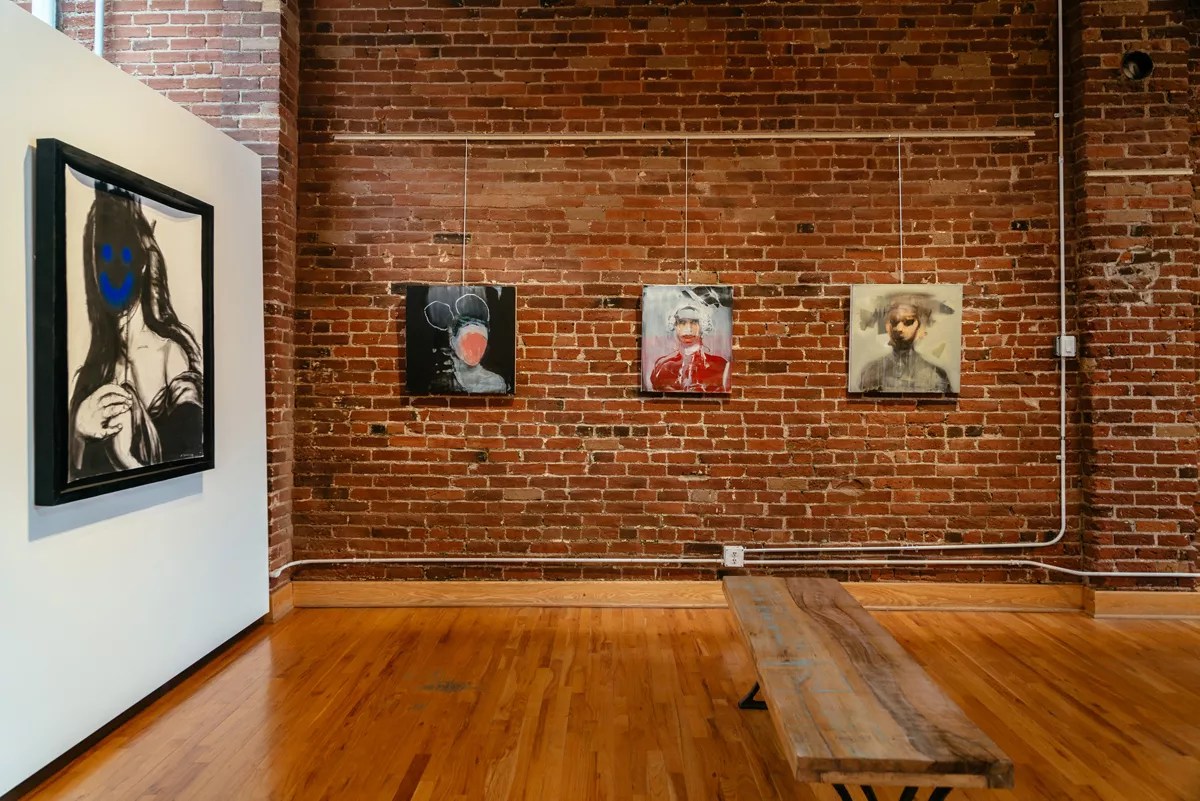Over at K Contemporary is an equally impressive show – Michael Dowling: You Should Have Seen the Other Guy – that throws abstraction and representation into a blender. Unlike Metier’s work, Michael Dowling‘s paintings and drawings tilt toward realism, with the portrait subjects largely recognizable even though he has substantially altered them, theatrically crossing out, covering over or selectively exposing different parts of the sitter’s faces, in the process turning the pieces into abstract hybrids. The underlying renderings have an Old Master-ish quality, which is reinforced by the romantically archaic clothing and hairstyles of the subjects. A Denver native, Dowling attended the Scuola Lorenzo de’ Medici in Florence, studying with the artist duo Rosenclaire, a pairing of Rose Shakinovski and Claire Gavronsky. He graduated in 2002 and the following year returned to Denver, where he continues to live and work. But he remains in touch with his Florentine teachers, whom he regards as his key mentors.