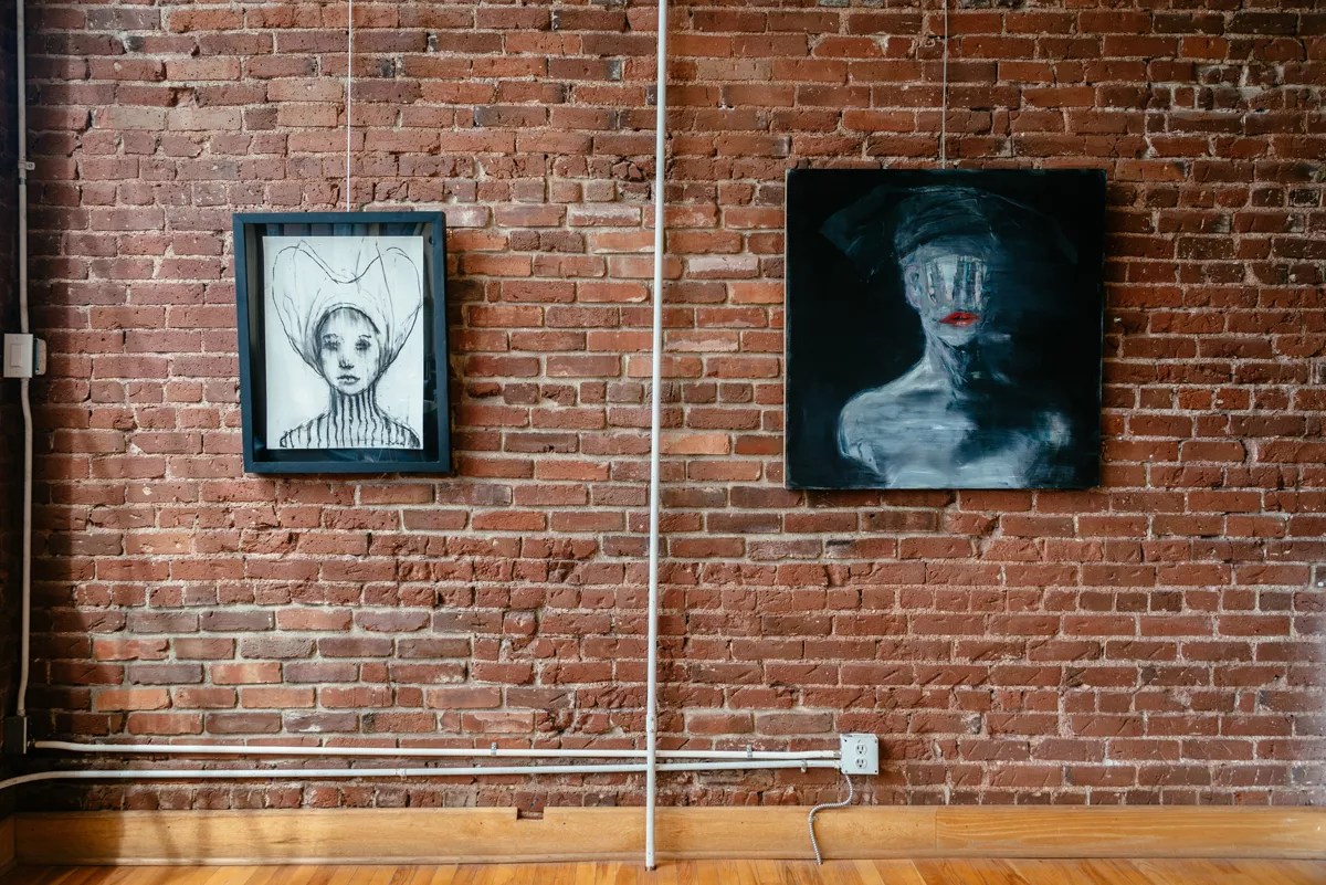 “Study for Acolyte”, charcoal and chalk on paper (L) and “Here’s to hoping you like me like that,” oil on panel (R), both by Michael Dowling.
