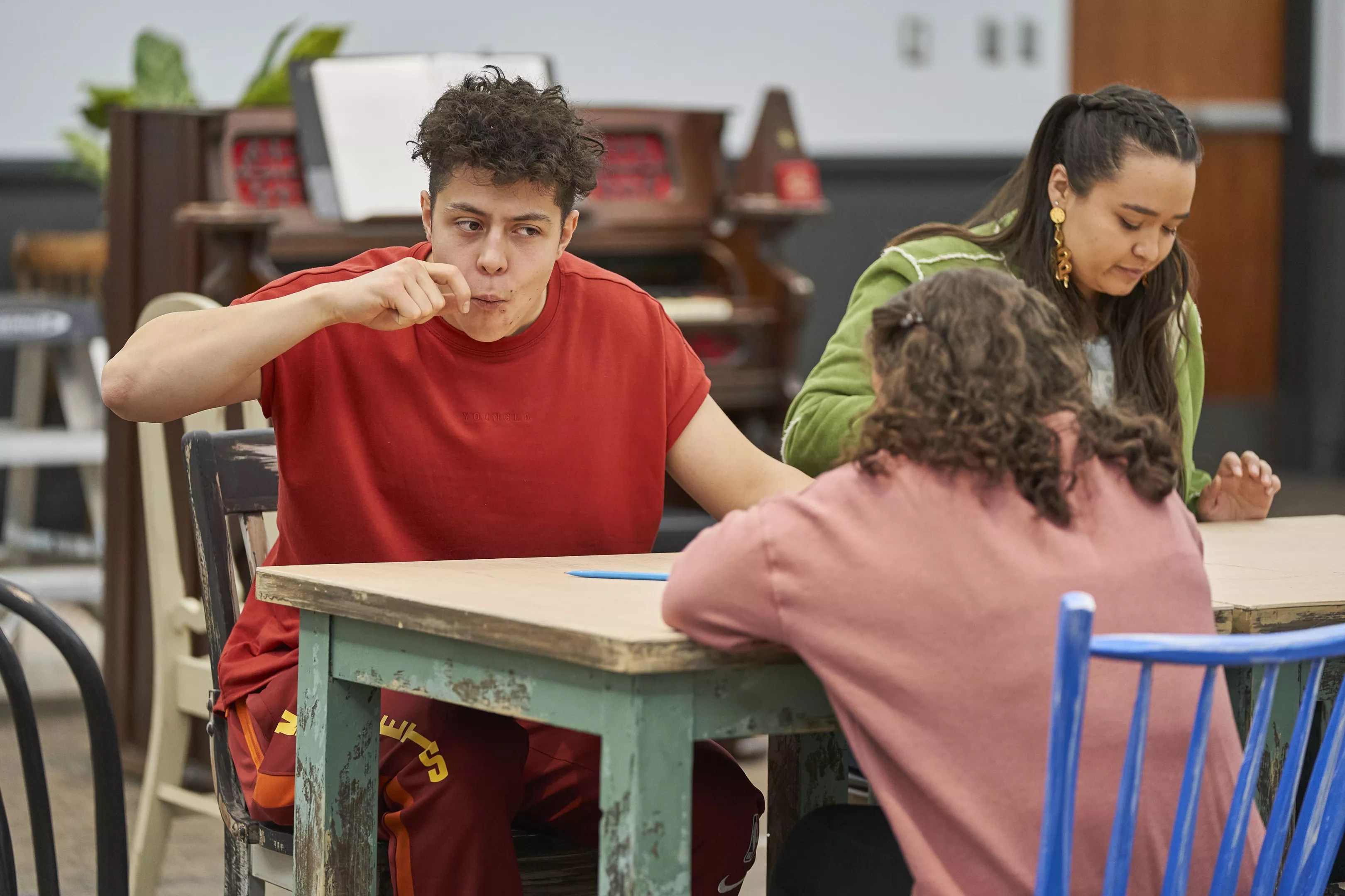 Thomas (Teej) Morgan-Arzola mimesmwhile Claylish Coldiron sits next to him during a rehearsal of Our Town.