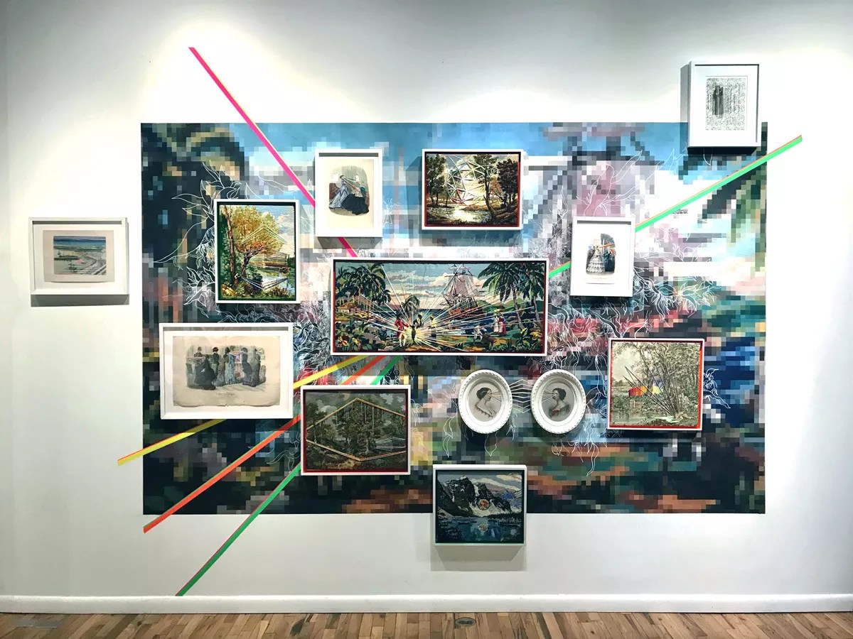 “The Past Is Present,” a large and impressive wall installation that debuted at the LA Art Show earlier this year, sums up her interests…and ambivalence. Applied directly to the wall is a vinyl wrap on which a pixilated scene has been printed; the scene is based on a framed needlepoint that’s hung off-center on top of the wrap, and the squares of the pixilation refer directly back to the yarn squares of the needlepoint. This central image depicts slaves and a slave master in a tropical setting, with a three-masted sailing ship in the harbor in the background.