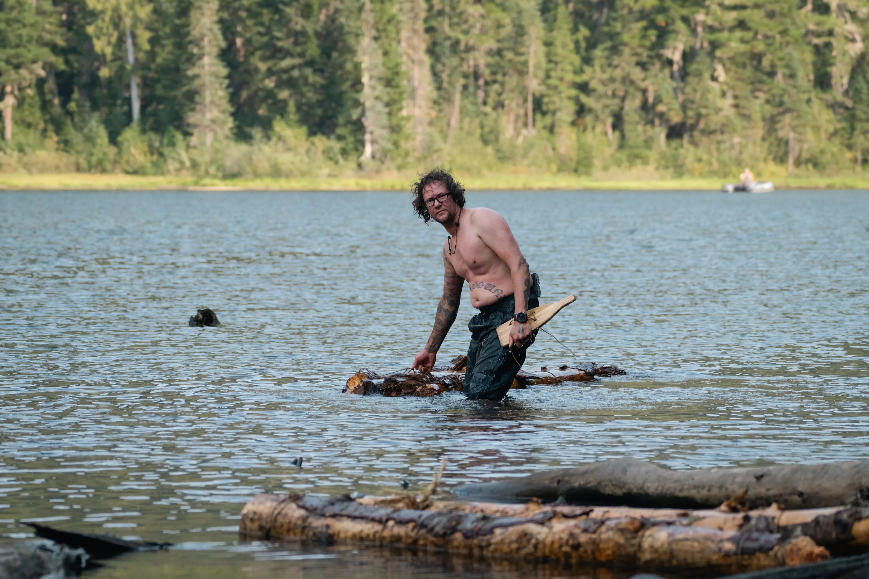 Willis plunged in with his raft next and quickly closed in, despite Kaminer’s early lead. They were in the middle of the lake when Hyak and two other survivalists followed suit. Others were right behind, slowly making their way through the 51-degree water, which threatened hypothermia with any more than an hour’s exposure. But Jakoben Thomas and his two knives (snagged in a greedy move during the first episode) were still on shore.