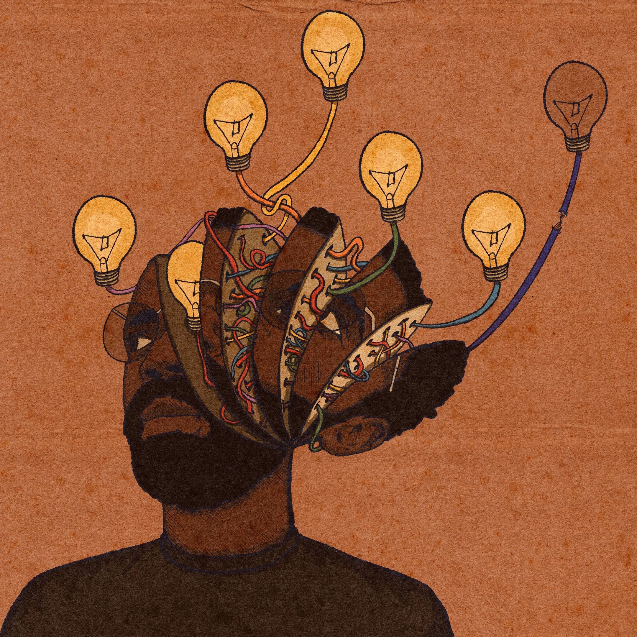 With a heavy emphasis on bold colors, nostalgic warmth and simplicity, Murray’s illustrations capture the creative energy in each of his subjects, expressed by vibrant details and ideas extending out of their heads.