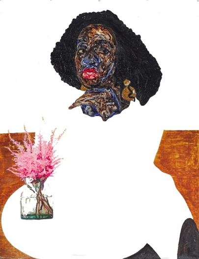 In “Pink Astilbe,” the spare scene contrasts with the rich texture of the artist’s painting technique, giving the seated figure a palpable energy.