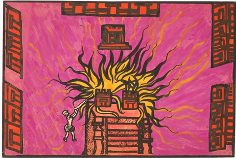 Leslie Tillett’s “Spainards Set Fire to the Temple at Tlatelolco.”