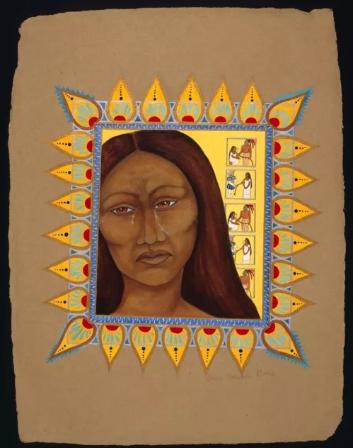 Malinche is portrayed perhaps most truthfully in a stunning image by Cecilia Alvarez from 1995, titled “La Malinche Had Her Reasons.” In the background are five boxes, each showing Malinche with a rope around her neck, held interchangeably by a conquistador and an Aztec man. Malinche’s face is magnified in the foreground; tears roll down her cheeks as she looks away from the boxes that represent the trauma she endured from both the foreigners and her own people.