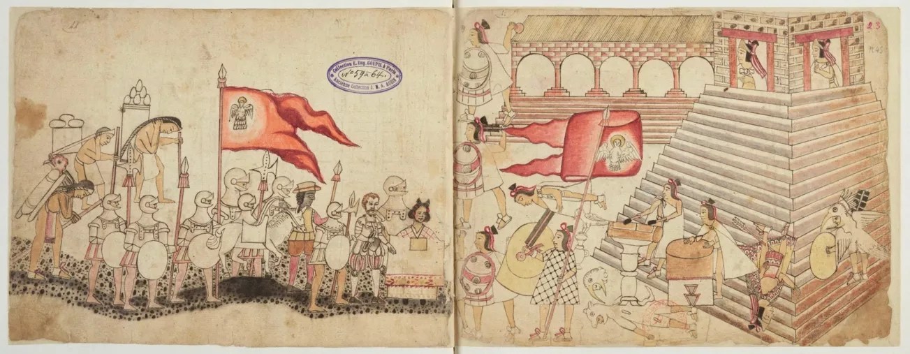 Malinche approaches Tenochtitlán with Cortés and the Spaniards, as shown in the sixteenth-century Codex Azcatitlán.