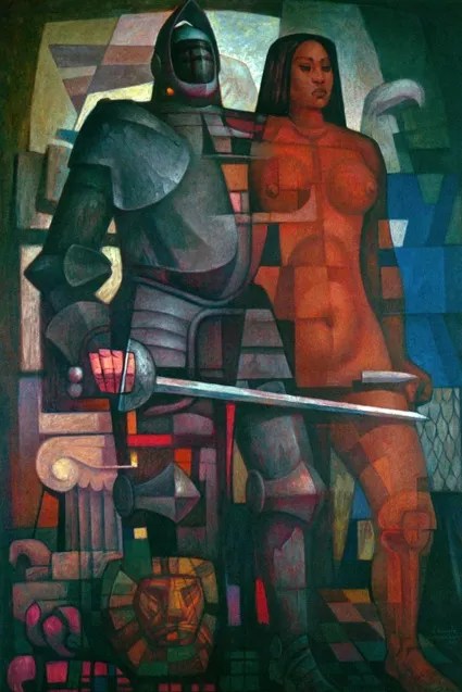 In the most monumental portrait, a 1964 oil painting titled “La pareja (The couple),” Cortés is dressed in a full suit of armor, with a helmet shielding his face. Malinche is naked – with more authentic skin tones and her hair flowing down. To the side of each, a lion and an eagle represent the union of the European and Indigenous races with pervasive tropes.