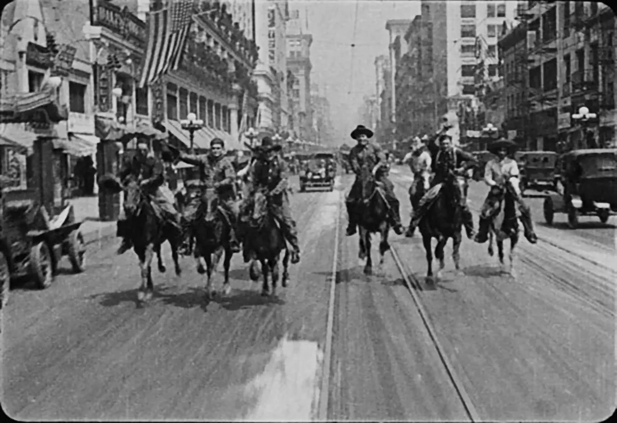 “The Set” includes iconographic views of scenery that conveyed the idea of the West to the rest of the world, including Bierstadt’s remarkable “Emigrants Crossing the Plains,” which has a frame that’s a work of art in itself, and Thomas Moran’s “Sunset, Green River Butte,” a subject the artist returned to over and over again. In “The Cast,” we see various stock Western characters, notably the cowboy, with Remington’s iconic “A Buck-Jumper” depicting a rider on a bucking bronco, and the Native American, as portrayed in Alexander Phimister Proctor’s “Indian Warrior,” a bronze of an Indian in full headdress on a striding horse. Other stock Western characters include the soldier, the trapper and the pioneer woman. Finally, in “The Drama,” we see perilous situations associated with the West. The disturbing “Captive,” by E. Irving Couse, shows an Indian sitting cross-legged behind a prone woman who has been tortured; there’s also a loop from the first American film to tell a story, Edwin S. Porter’s The Great Train Robbery, made in 1903.