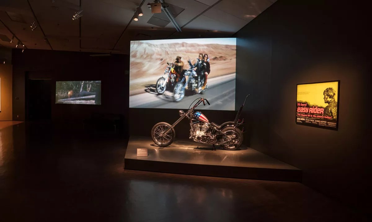 With the next section, “Sergio Leone,” the show returns to a director. At one point, Italy was producing around a hundred Westerns a year, Smith noted, but Sergio Leone’s name is essentially synonymous with the “spaghetti Western.” Leone emerged as the genius of the movement, crossing the traditions of the American Western with the art-film sensibility of Italian cinema. Here, three curved projection screens face one another, with close-ups of Clint Eastwood, Lee Van Cleef and Eli Wallach in the title roles, respectively, of Leone’s masterpiece, The Good, The Bad and The Ugly; the experience is made complete by the strains of Ennio Morricone’s famous score. The viewer then moves on to “The Counterculture,” which highlights what I’d call “post-Westerns” – films that Leone’s work presaged – including a clip from Easy Rider accompanied by the “Captain America” motorcycle, and Pat Garrett and Billy the Kid, with the Bob Dylan score playing softly in the background. This section is paired with period posters and paintings such as Andy Warhol’s “The American Indian (Russell Means),” which depicts the activist in traditional dress.
